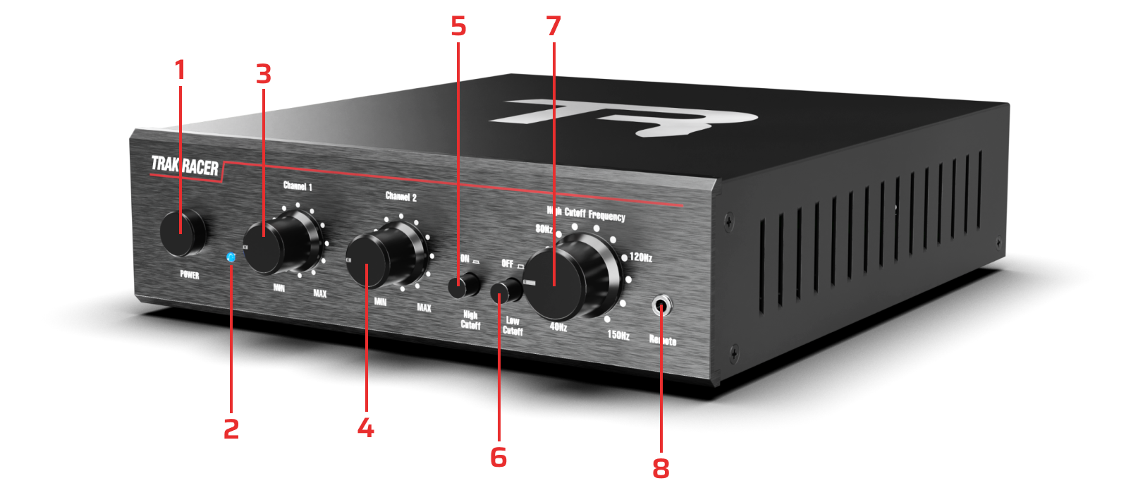 The remote control lets you adjust power instantly. The 2 TR logo rubbers can be removed, allowing you to mount the remote control anywhere for a sleek, screw-free look.